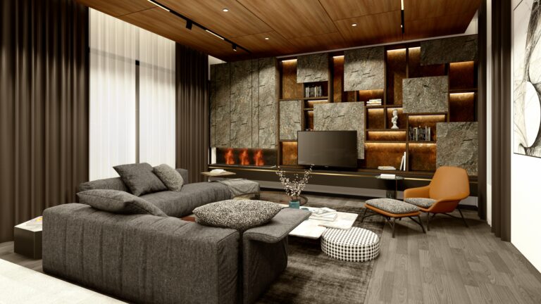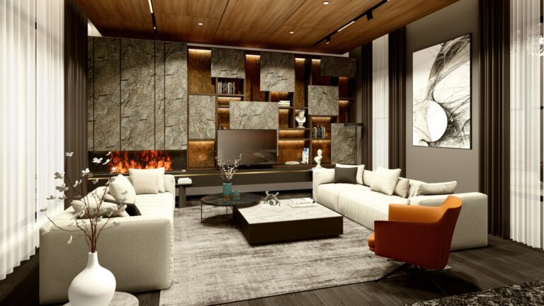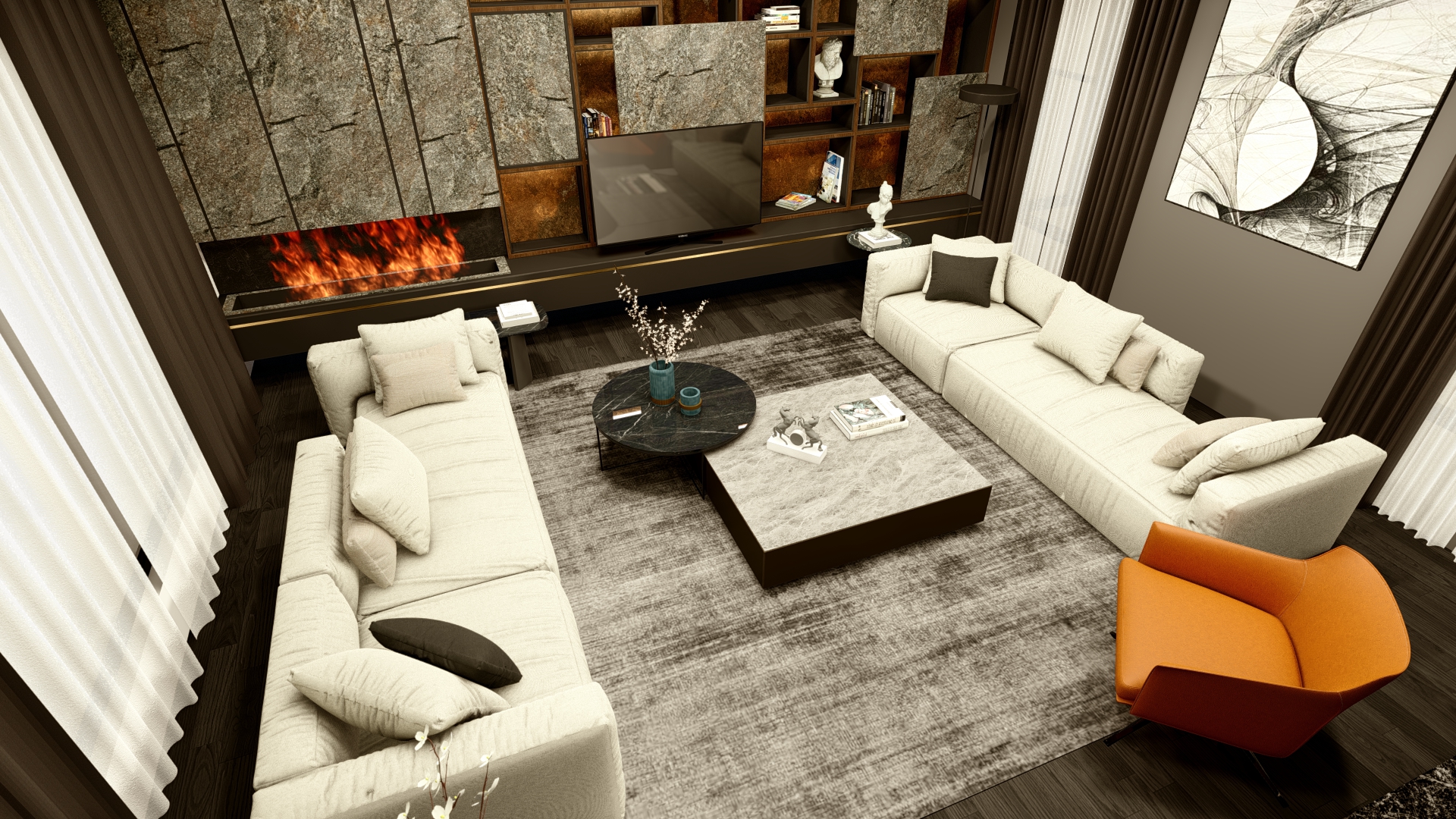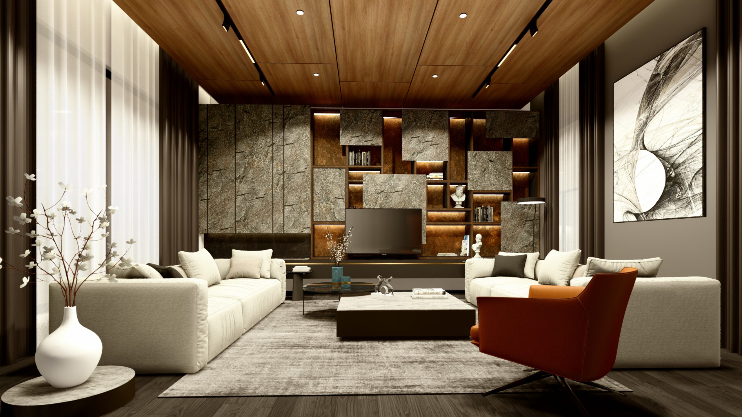 Our modern living area renderings present stylish furniture arrangements, balanced lighting, and contemporary finishes. These realistic visuals help clients experience comfort and elegance before construction begins.